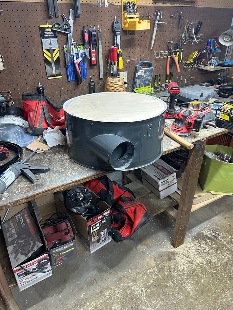 The cyclone mounts to the lid of the trash can and connects between the blower and the ductwork. Large chips and dust spiral down into the can, while only the finest particles continue on to the filter.