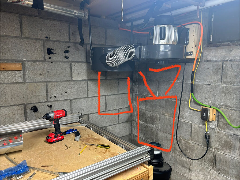 Instead of putting the unit back on its original cart-style stand, I decided to mount the blower directly to the wall. This saves floor space and makes the ducting run more efficient.
